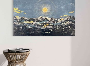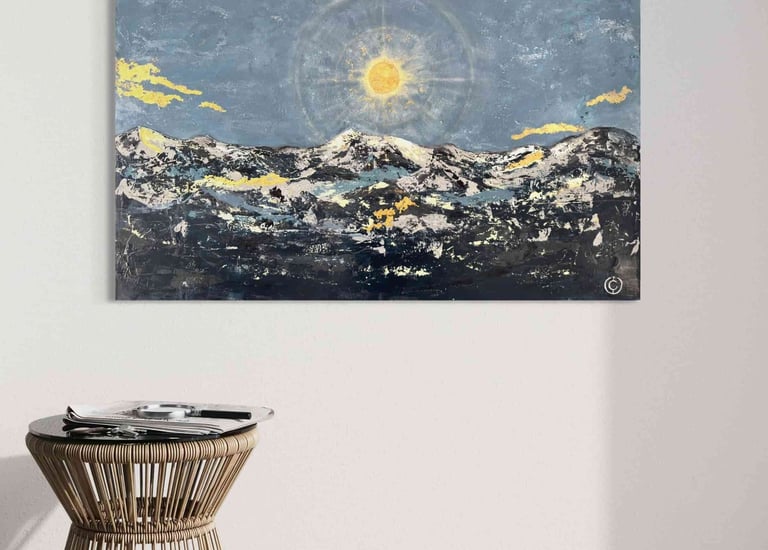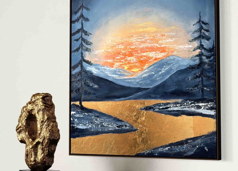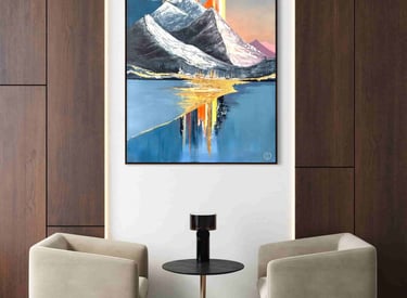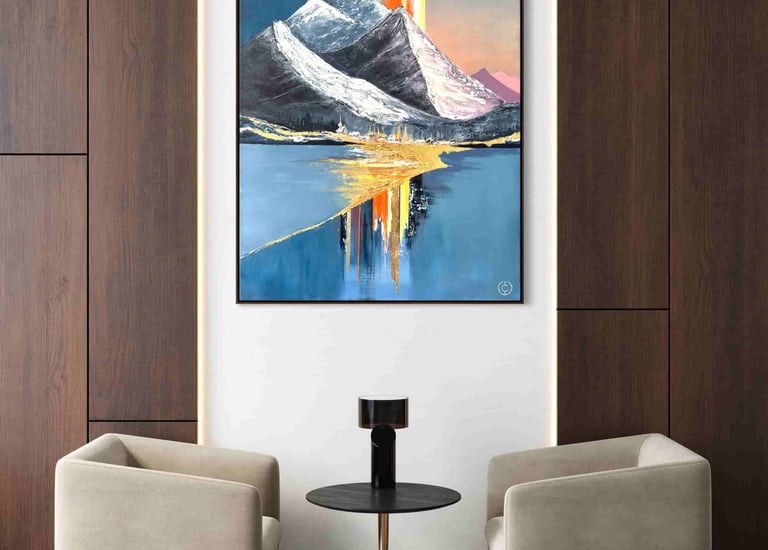 Golden reflections and vibrant colour strokes bring this mountain scene to life, merging calm realism with expressive energy.