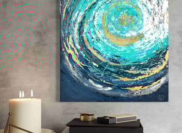 Radiates with swirling turquoise, deep blues, and shimmering gold, capturing the essence of creation, renewal, and powerful life energy at its core.