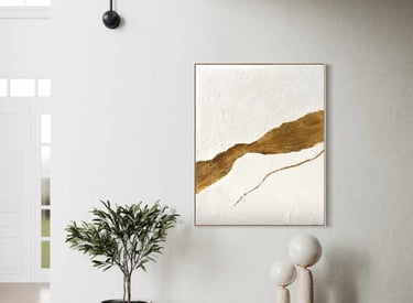 A flowing band of gold traces an unseen passage, symbolizing enduring ties of love, home, and belonging. Through textured whites and luminous gold, the work invites reflection on journeys past and unfolding, and on what remains constant between them.
