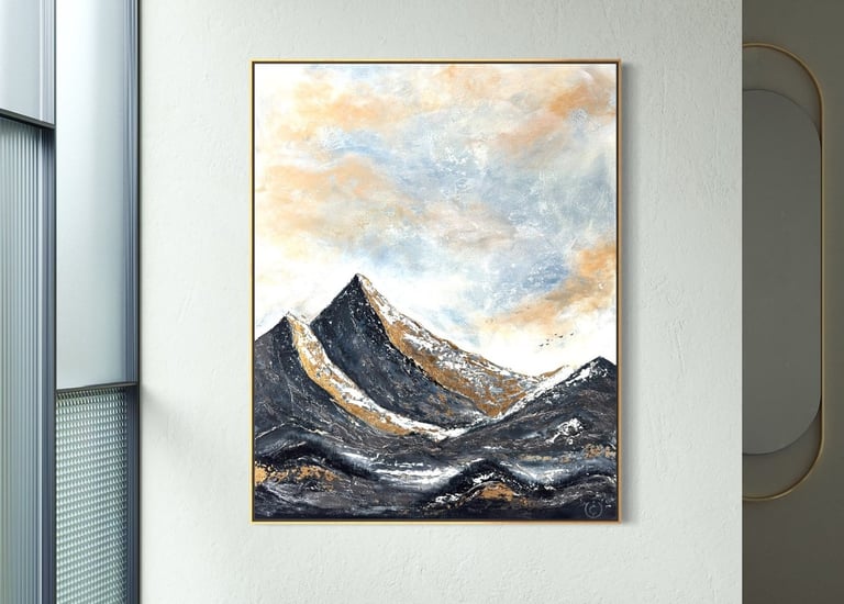 Quiet strength of golden-touched peaks beneath a soft, glowing sky, bringing the timeless power of the mountains into your space.