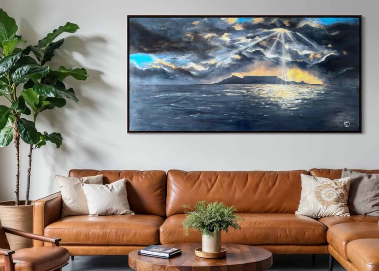 Dramatic moment when golden rays break through stormy clouds and illuminate the ocean, revealing the iconic silhouette of Cape Town’s most famous peak in a breathtaking display of contrast and power.