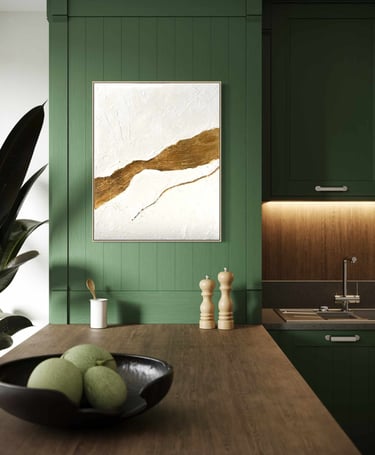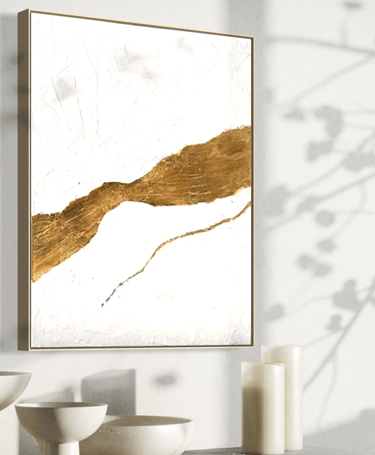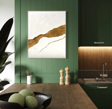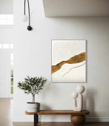 Textured whites evoke openness, breath, and stillness, while gold becomes a symbol of what endures through transition: love, home, and the invisible ties that carry us forward. The work invites reflection on journeys taken and those still unfolding, and on the places, people, and feelings that remain constant between them.