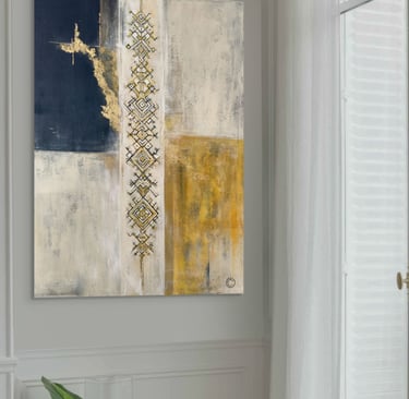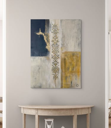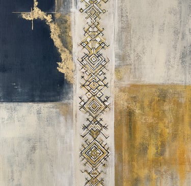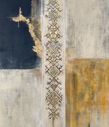 Inspired by the Ukrainian rushnyk - a traditional ceremonial cloth symbolizing protection, continuity, and home - this artwork reflects the enduring bond between identity and belonging. The vertical ornamental motif echoes ancestral patterns passed through generations, serving as a symbolic path that guides one back to their roots.