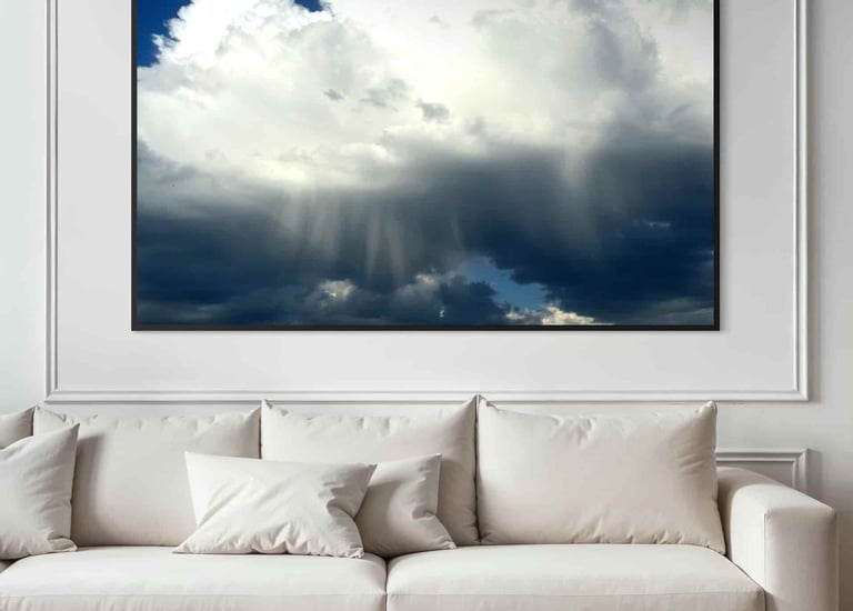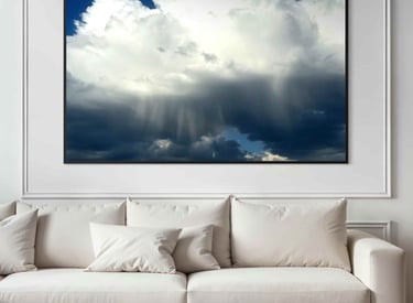A dramatic skyscape capturing bright, billowing clouds and soft streaks of rainfall drifting through shifting light- nature’s quiet power frozen in a single, breathtaking moment.