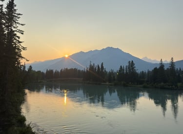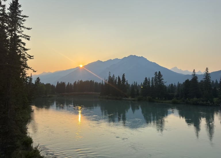 A warm mountain sunset melts into the evening sky, casting golden light across calm waters and quiet evergreen silhouettes.